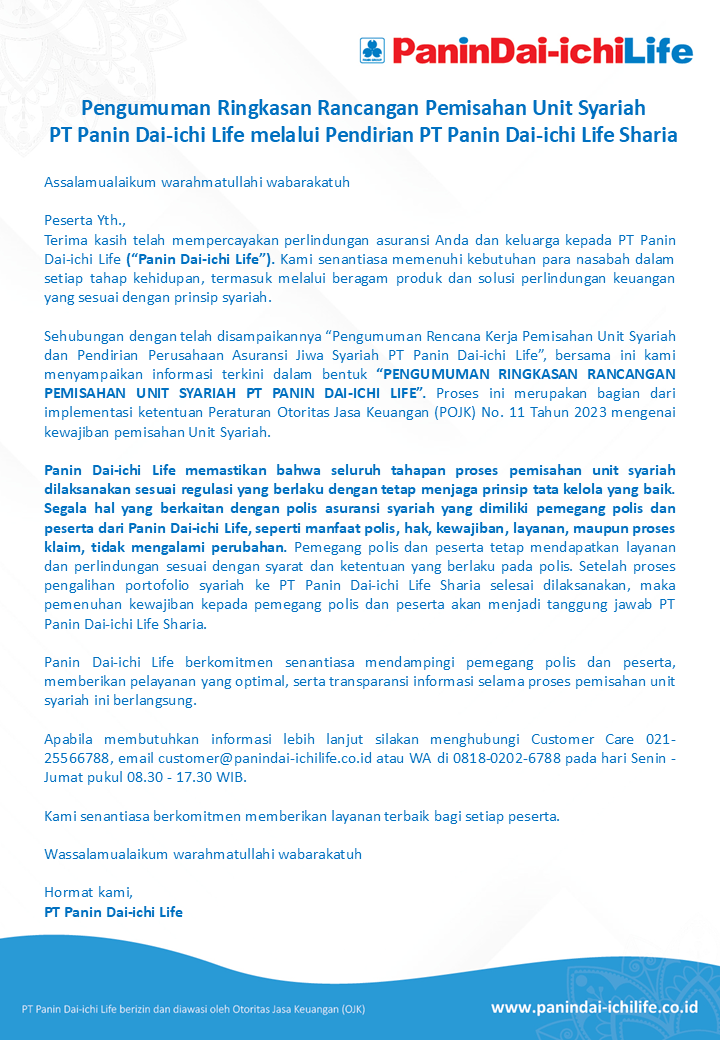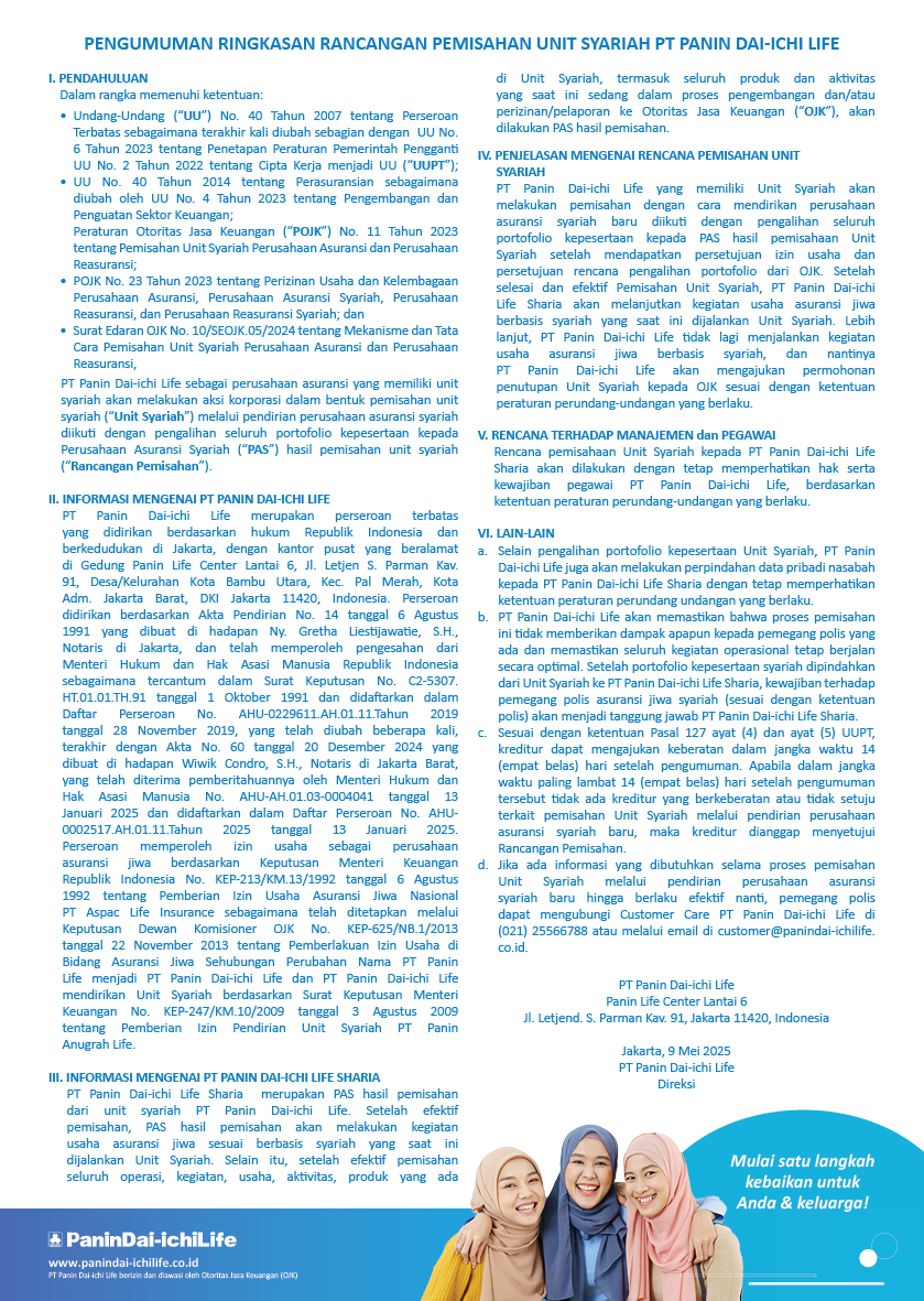 Pengumuman Ringkasan Rancangan Pemisahan Unit Syariah PT Panin Dai-ichi Life melalui Pendirian PT Panin Dai-ichi Life Sharia